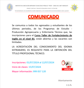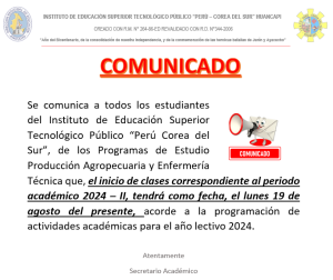 COMUNICADO La Dirección General del Instituto de Educación Superior Tecnológico Público...Leer más agosto 28, 2024